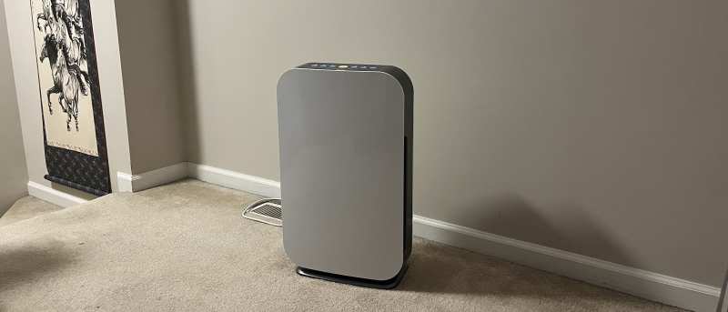 This air purifier is capable of moving a good amount of air, but in operation, it isn’t the quietest at the higher settings. Our review unit reached 49dB, which is similar to the noise level of the space heater I use. Or, for a more general example, it’s like having soft music constantly playing. It isn’t too intrusive, but it certainly isn’t silent.